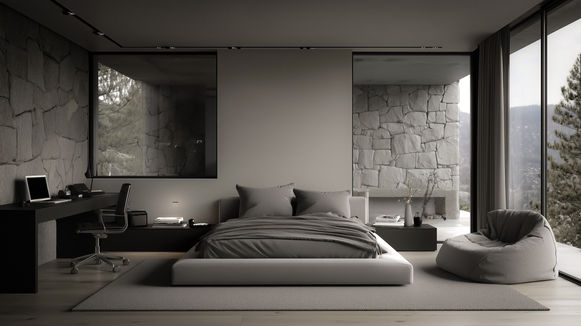 El interiorismo, concebido como una extensión natural de la arquitectura, se basa en una paleta de grises, negros y texturas orgánicas. El mobiliario, las superficies continuas y la iluminación tenue configuran atmósferas introspectivas, donde cada rincón invita al recogimiento. Las grandes aperturas acristaladas permiten que el paisaje penetre en el espacio, diluyendo los límites entre interior y exterior, y convirtiendo la naturaleza en parte activa de la experiencia doméstica.